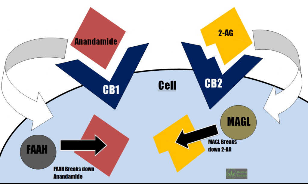 - Lastly there are the enzymes that break down the cannabinoid switches so things don’t stay on or off longer than needed. There are 2 main enzymes: FAAH and MAGL-these are acronyms but the full names aren’t important here.